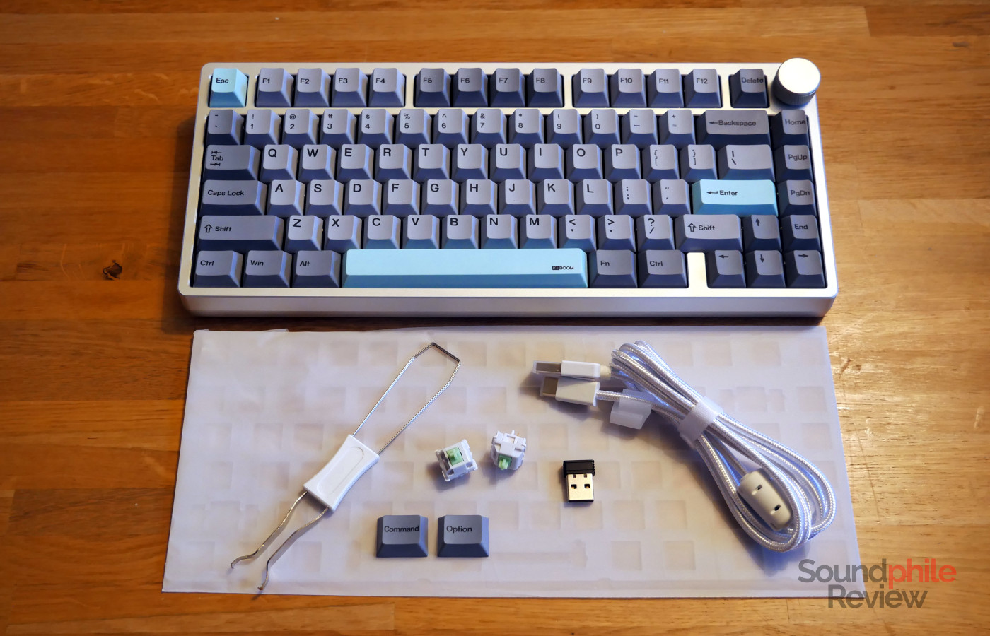 I found it interesting that my Moonshadow V2 came in the same box as the v1, even though the contents are quite different: beyond the keyboard itself, there was only a keycap/switch combo puller, a manual and a USB to USB-C cable. There is also a USB wireless receiver, which however does not have a slot on the keyboard itself for keeping when not in use.