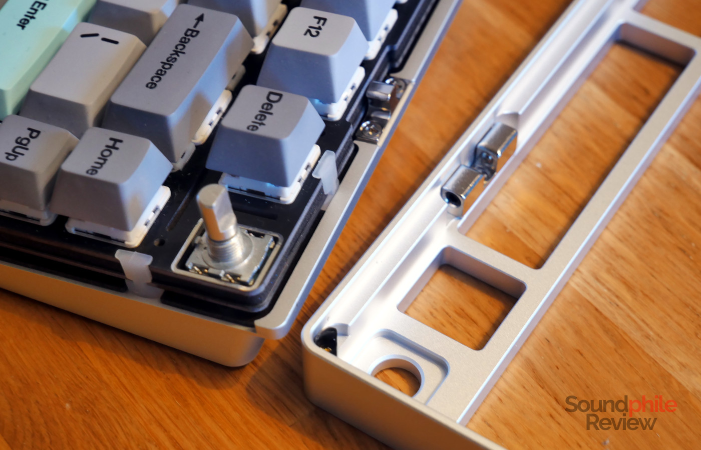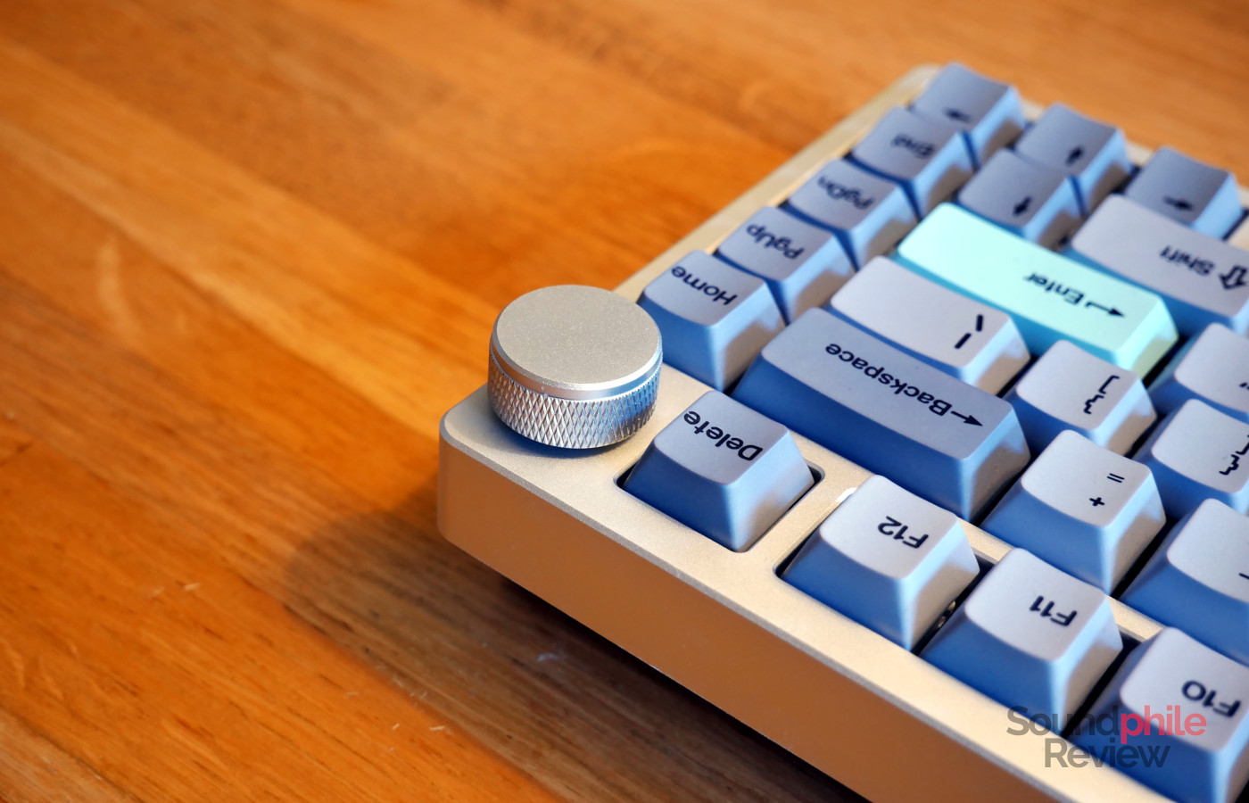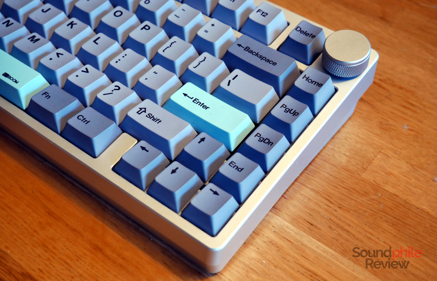 As the keyboard is a 75%, it is compact and sheds the traditional set of keys found on full-size or even in TKL boards; still, KiiBoom managed to include the delete, home, page up, page down and end keys, which make the selection quite complete. Unfortunately, the Moonshadow V2 only comes with an ANSI layout. I write “unfortunately” because one thing that I found missing from the Moonshadow V2 is a right alt key. This is fundamental for many European languages: as an example, in Italian it is used to type “@”, or in Polish it’s used to type accented letters; without it it is almost impossible to type. The spacebar is quite big and a smaller one would probably have allowed for an additional alt key. There is also an aluminium rotary encoder – a knob – in the top right corner, which is mapped by default as a volume knob.