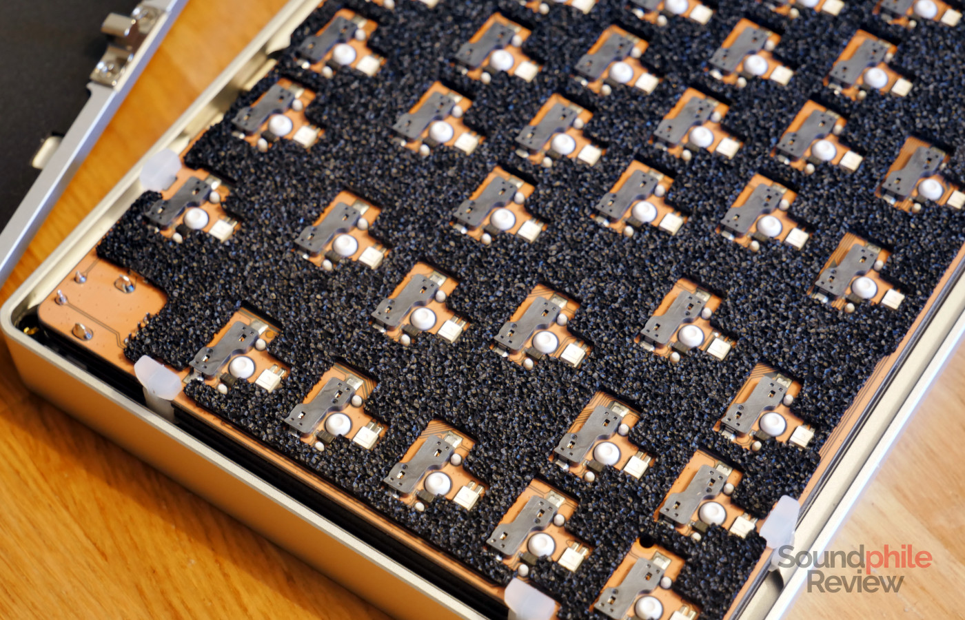 The switches are all hot-swappable and they are installed on a gasket mount, with an FR4 (fibreglass and epoxy resin) board and acoustic measures like a sandwich of PORON foam and foam both under the switch sockets and on the bottom of the board. The LEDs are South-facing to make them more widely compatible with Cherry profile keycaps.