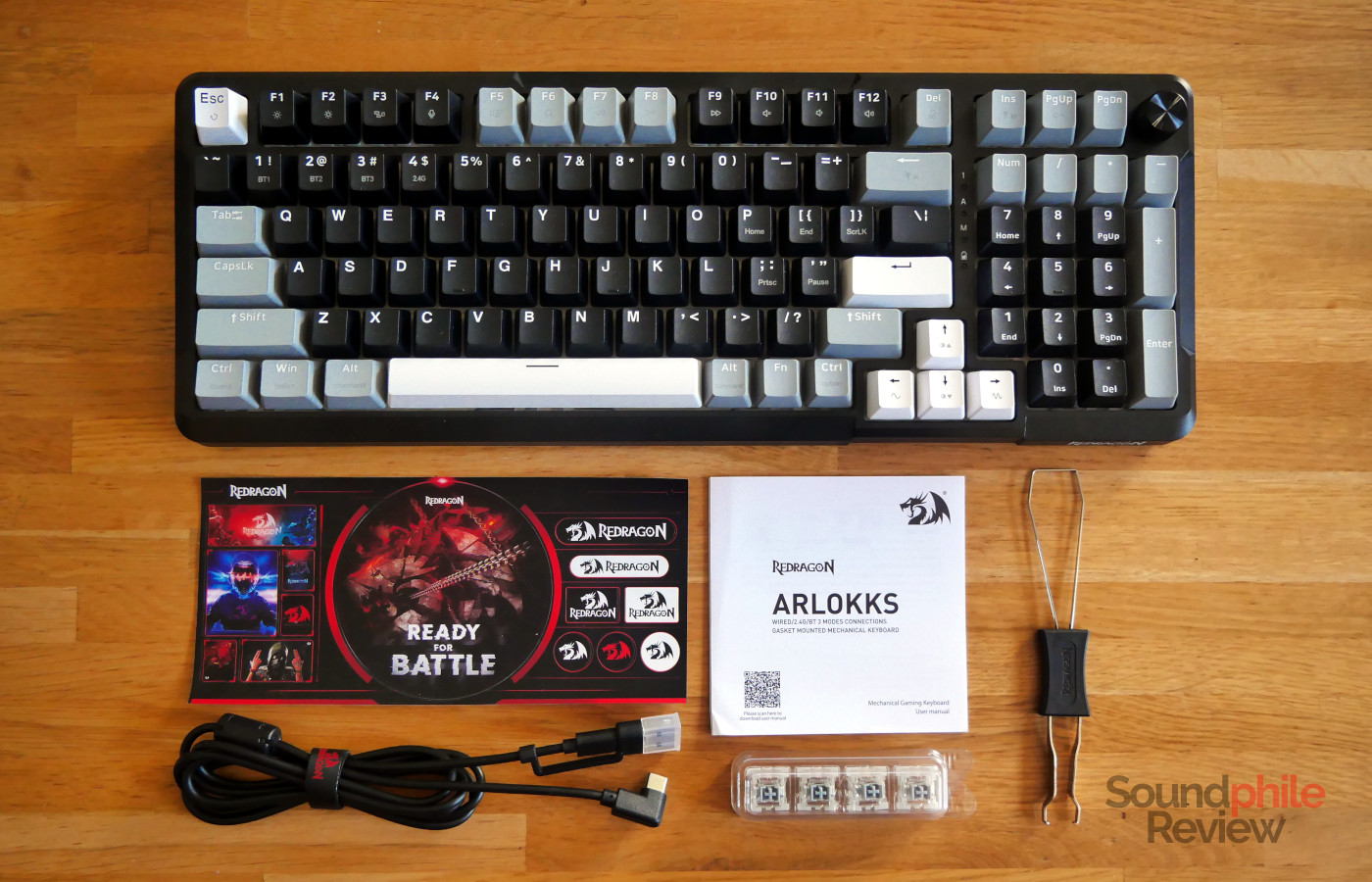 The Redragon K742 Arlokks comes with a combined keycap and switch puller, a USB-C to right-angled USB-C cable (with an adapter to make the straight USB-C connector a USB-A), four spare switches and a manual.