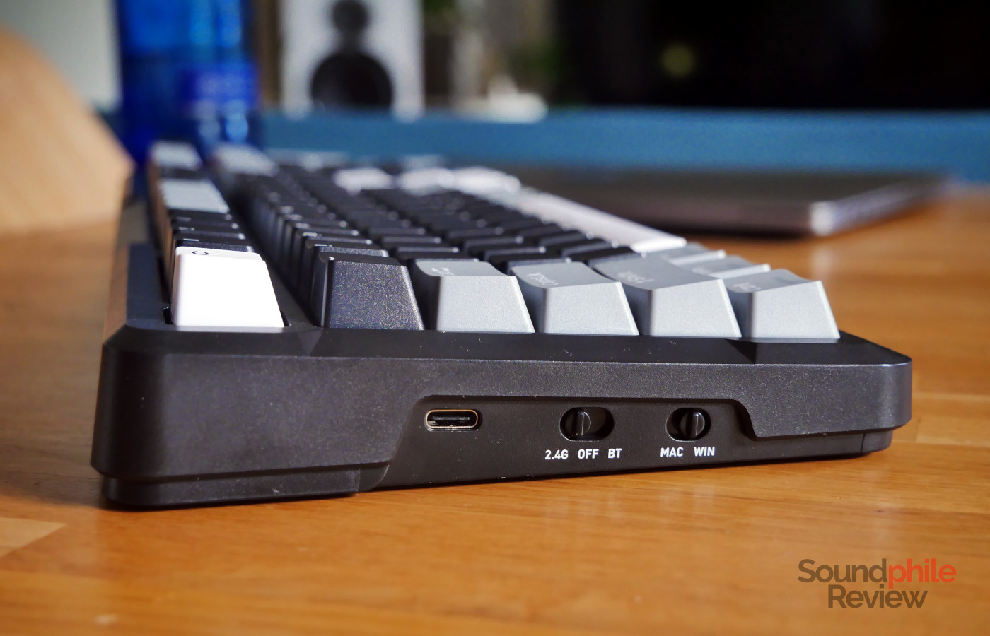 On top of the original layout, the first peculiarity I noticed about the Redragon K742 Arlokks is that it has the USB-C port and the switches to select the connection and the layout (Windows or Mac) on the left hand side, rather than on the back. On one hand this is convenient, because it makes it much easier to see the connector and switches, but on the other is rather inconvenient as having the cable run from the left hand side isn’t as convenient as having it run from the back. The switches are also something you shouldn’t deal with often: not many people switch between multiple devices with different needs. The 2.4 GHz USB adapter has its own slot on the right hand side.