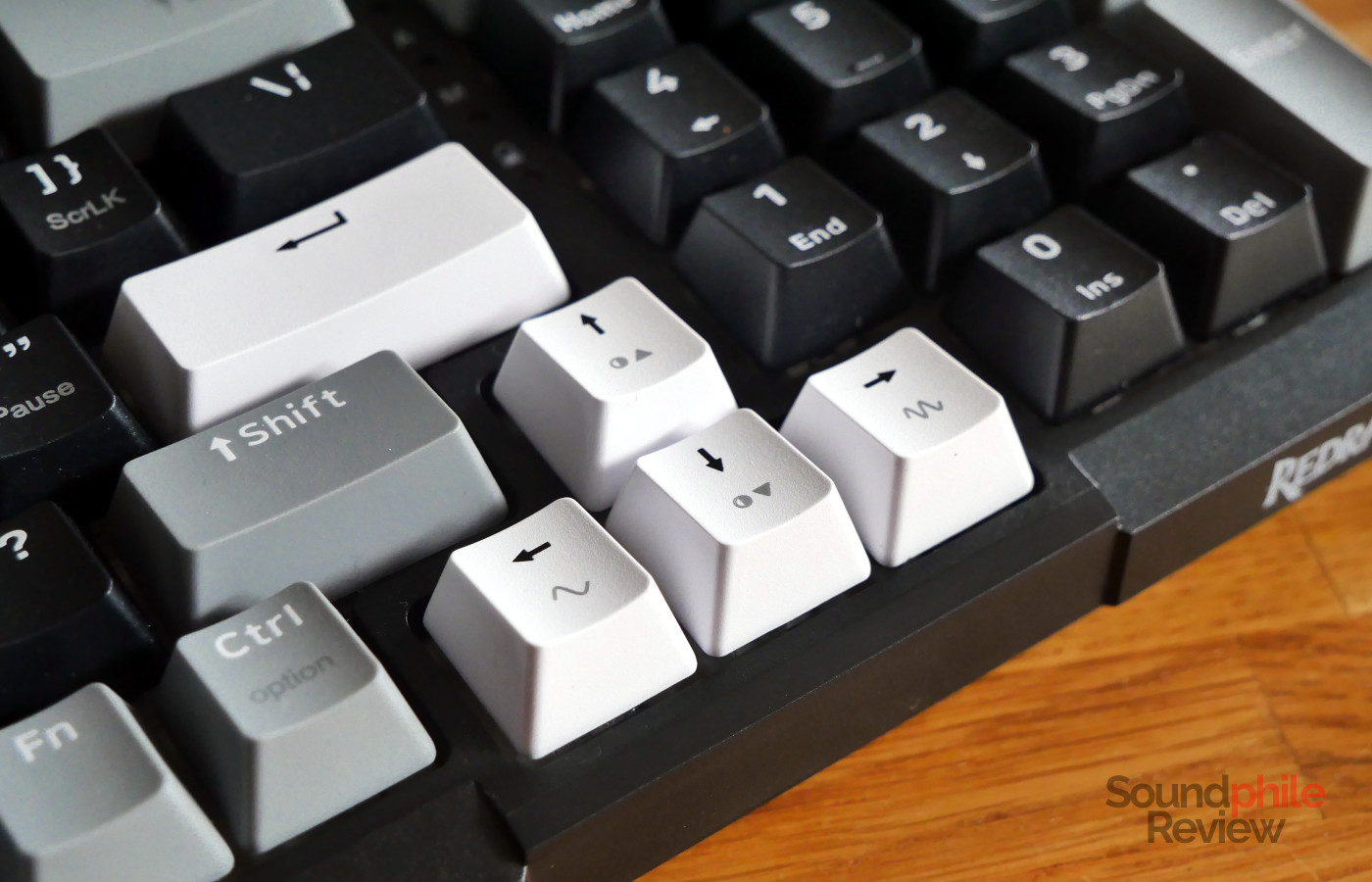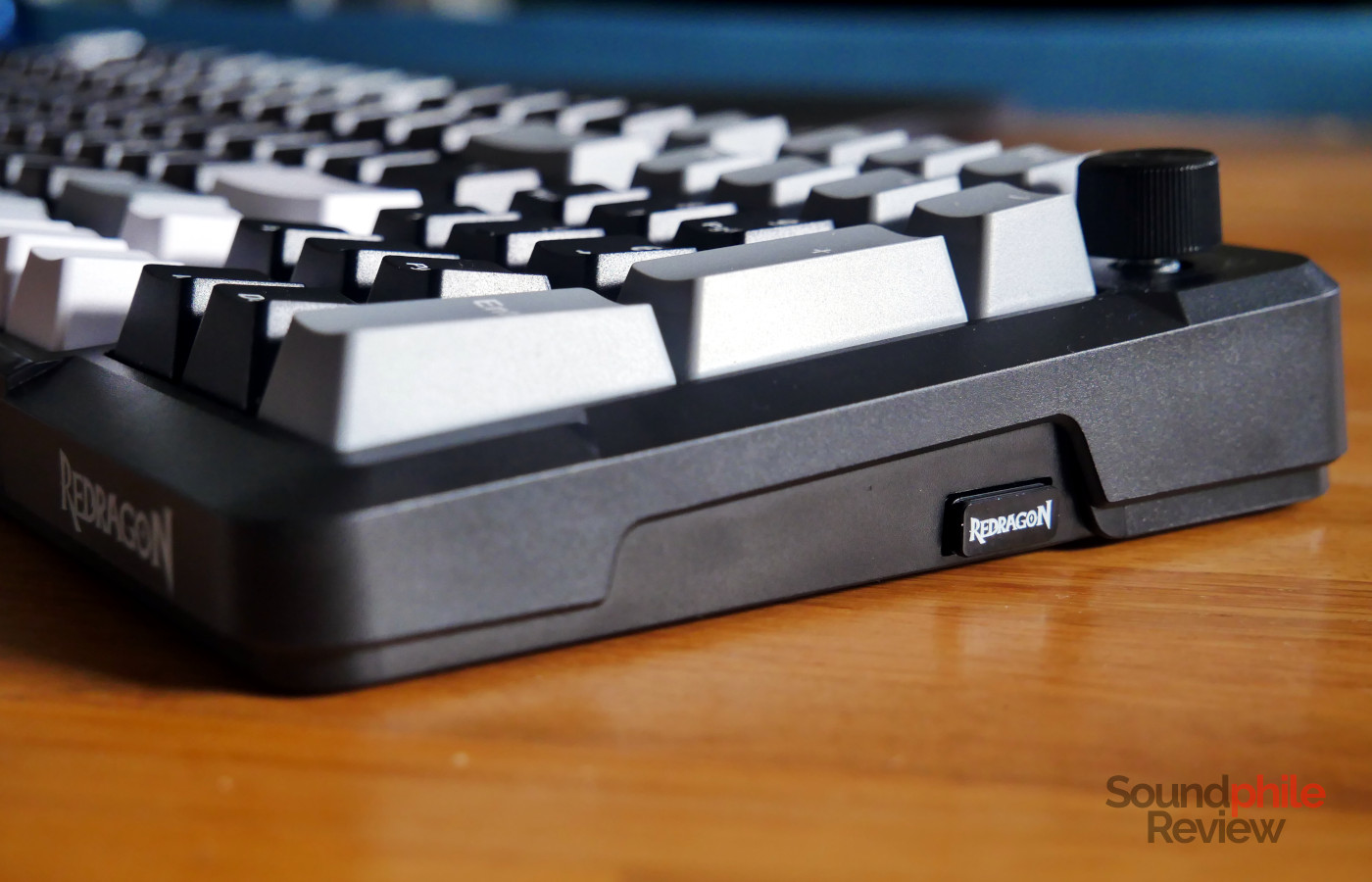 The Redragon K742 comes with an OEM profile keycap set in black, grey and white. The keycaps are made of double-shot PBT with a nice slightly grainy texture; they come with function legends on the relevant keys, however these are printed in grey which results in poor legibility due to the low contrast. The switches are pre-lubed linear RPC, which are made by Redragon themselves; the keyboard’s page on Amazon says that they have an activation force of around 40 g, which places them as relatively lightweight, and a travel distance of 3.6 mm.