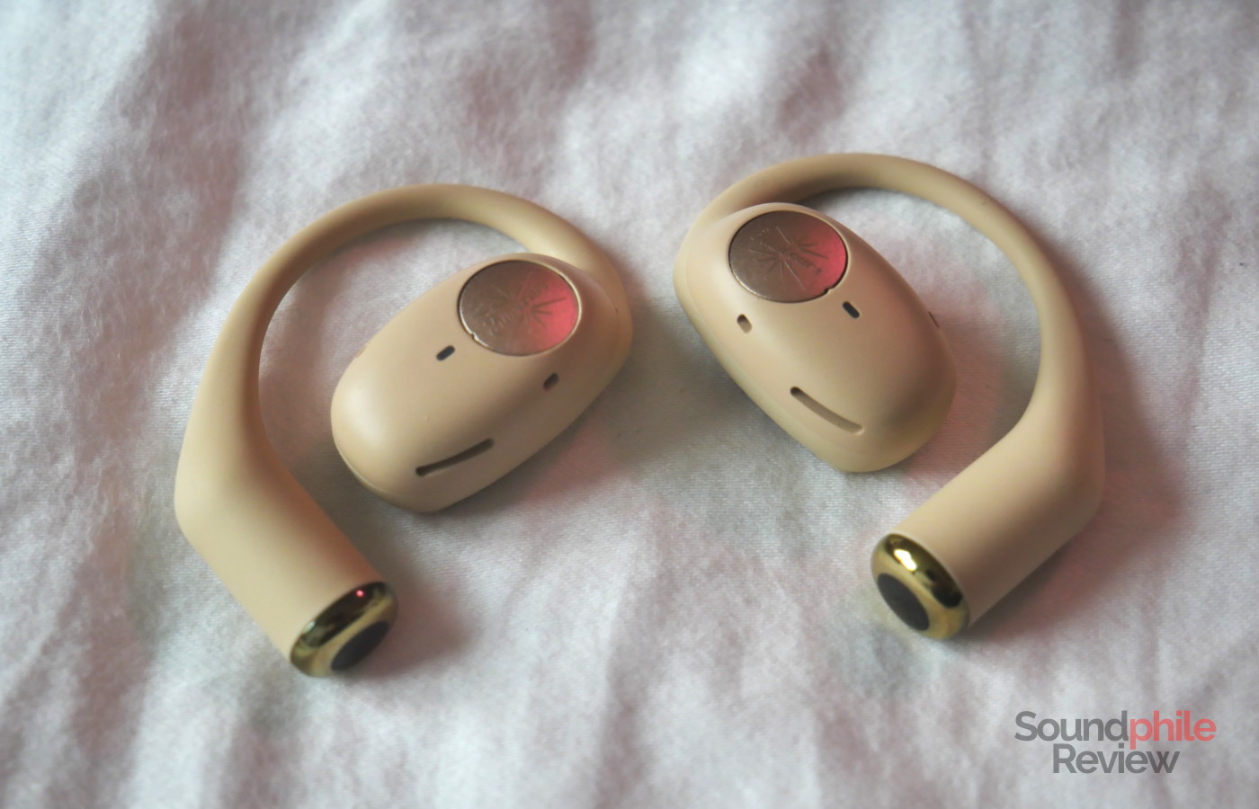 The Kiwi Ears Spark sport a traditional over-the-ear hook design: the main earpiece is pill-shaped and has a metal plate (which is touch-sensitive and is used for controls), while the hook gets bulkier near the end as this part probably contains the battery. They are covered in soft-touch plastic, except for the very end of the hooks which is hard plastic. There is also a status LED next to the metal faceplate.
