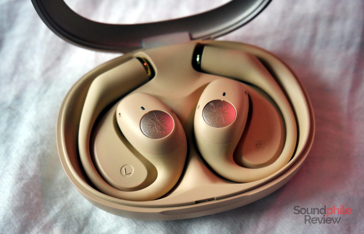 The case is very simple: the bottom is made of soft-touch plastic, while the lid is made of metal. The front has a status LED and the back has a USB-C port; inside there are no metal contacts at all, as the earphones are charged wirelessly. There are magnets where the ends of the ear hooks are which keep the earpieces in place. A peculiarity of the case is that the lid is open: the window you see is actually empty. There is a magnet which keeps the lid shut, which is very convenient. Its strength, combined with the mechanism in the hinge, is however very high, to the point where you need to be careful as the lid can pinch your fingers.